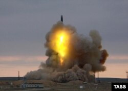 Ресей RS-18 құрлықаралық қанатты зымыранын сынақтан өткізу үшін Байқоңырдан атып жатыр. Көрнекі сурет. 9 қараша 2006 жыл