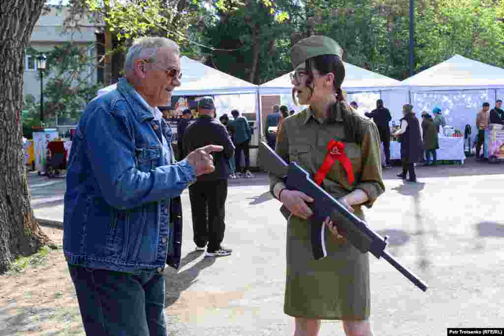 12Бауыржан Момышұлы болып киініп алған ер адаммен суретке түсіп жатқан тұрғын.