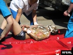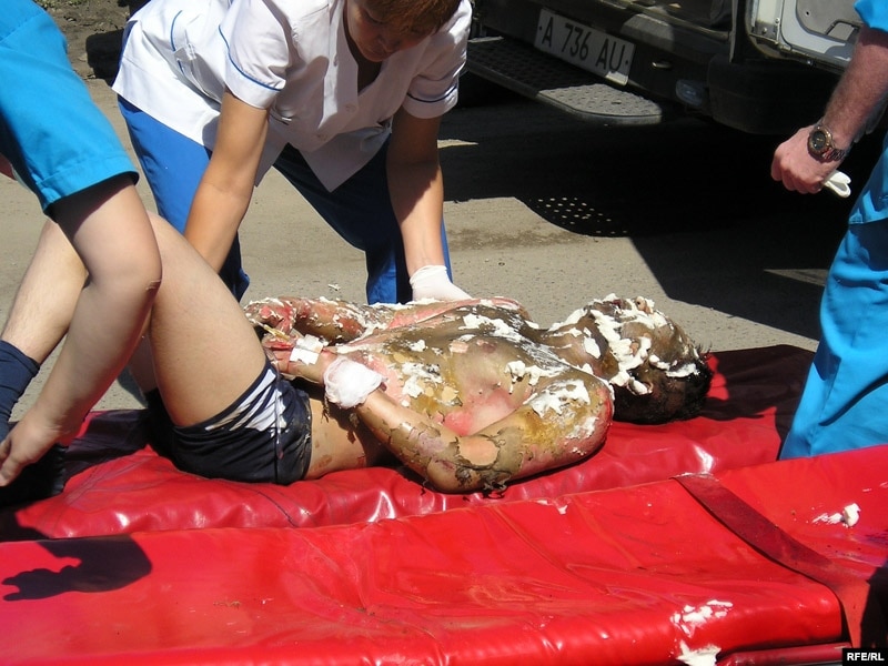 Шаңырақтағы қақтығыста әлдекімдер тірідей өртеген полиция офицері бірер күннен кейін ауруханада қаза болды. Шаңырақ, 14 шілде 2006 ж.