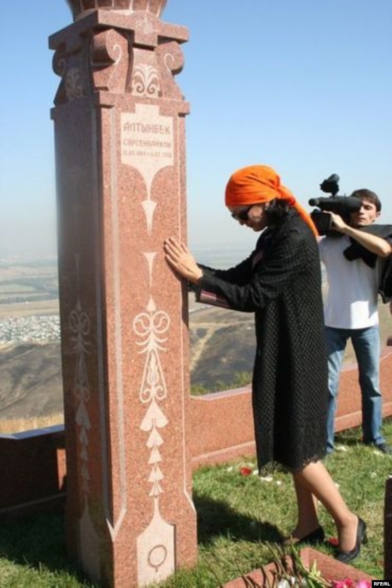 Алтынбек Сарсенбайұлының жары Салтанат Атушева марқұм күйеуінің бейітінің басына құлпытас орнатылған күні. 12 қыркүйек 2006 жыл.