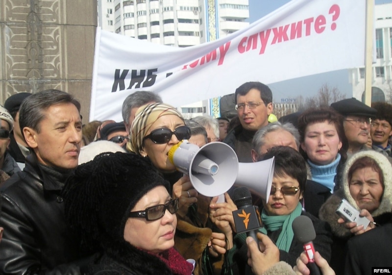 Қаза тапқан оппозиция қайраткерлері Алтынбек Сәрсенбайұлы, Заманбек Нұрқаділов және тәуелсіз журналист Асхат Шәріпжановты еске алу жиыны. Дыбыс күшейткіш құралмен сөйлеп тұрған - Алтынбек Сәрсенбайұлының жесірі Салтанат Атушева. Сол жағында – Болат Әбілов, оң жағында – Зәуреш Батталова, одан әріректе Ораз Жандосов тұр. Алматы, 26 ақпан 2006 жыл.