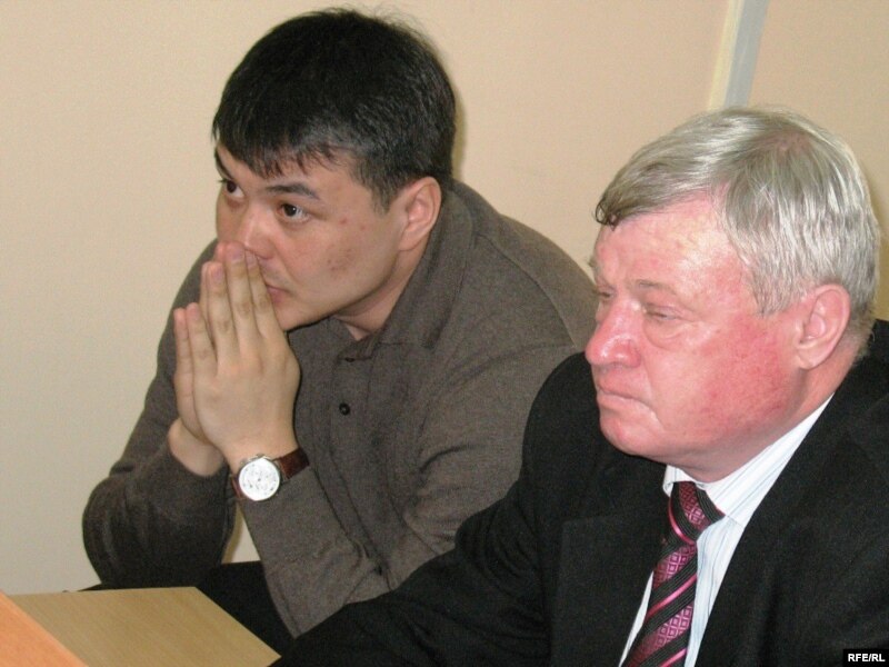 Жәбірленуші Мұрат Есемсейітов (сол жақта) пен оның қорғаушысы Владимир Церенко. Астана, 31 наурыз 2009 ж.