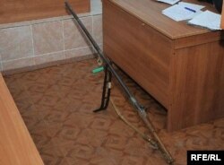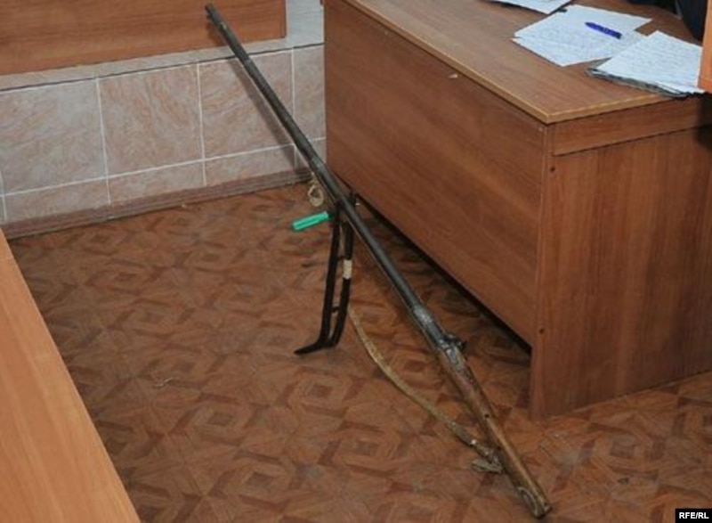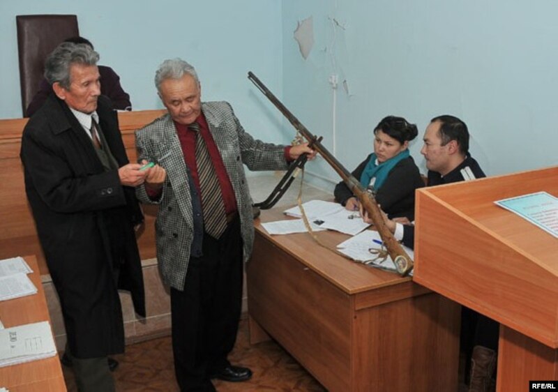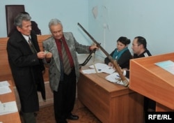 Талапкер Төлеген Сағындықов (сол жақта) сот приставына даулы мылтықтың өз атасынан қалған мұра екендігін дәлелдер айтып тұр. Атырау, қараша, 2009 жыл.