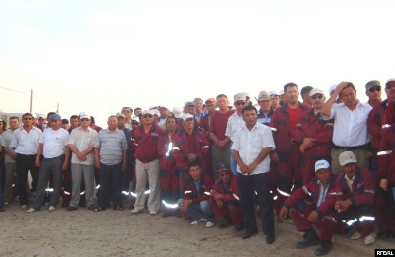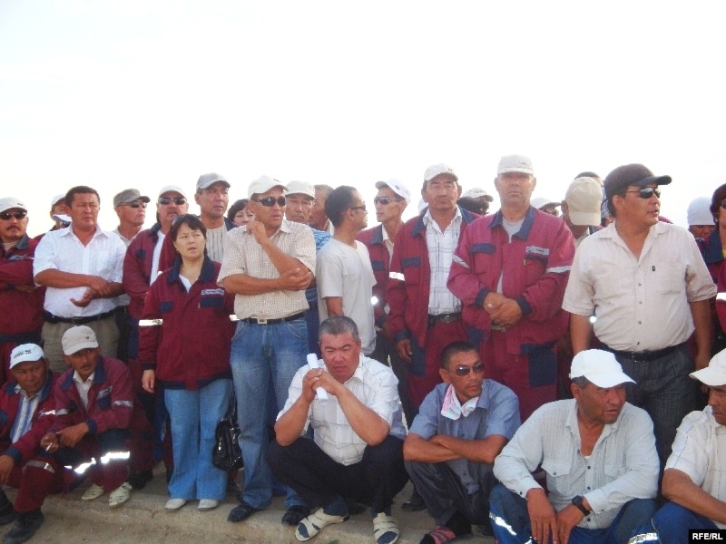«ЖайықМұнайГаз» компаниясының жұмысшылары еңбекақы төлеміне қатысты талаппен жұмысты тоқтатты. Аққыстау ауылы, Исатай ауданы, Атырау облысы. 3 шілде 2010 жыл.