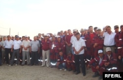 Аштық жариялап жатқандарға қолдау білдірген «ЖайықМұнайГаз» компаниясының жұмысшылары басқарма кеңсесінің алдында тұр. Аққыстау ауылы, Исатай ауданы, Атырау облысы. 3 шілде 2010 жыл.