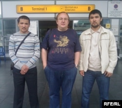 Суретте солдан оңға: қазақ босқыны Абылай Төлегенов, мәскеулік «Мемориал» адам құқығын қорғаушы ұйымы Орталықазиялық бағдарламасының директоры Виталий Пономарев және қазақ босқыны Қуаныш Кәменов. Прага, , 23 маусым 2009 жыл.