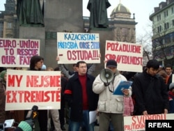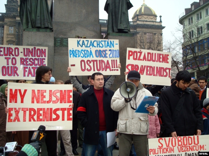Чехияның астанасында қазақ босқындары өткізген наразылық жиыны. Босқындар өкілі мәлімдемені оқып тұр. Прага, 7 ақпан 2009 жыл.