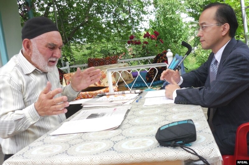 Мамед Алиев (сол жақта) Жапон елшілігінің өкілі Катамото Масахиромен сөйлесіп отыр. Леңгір қаласы, Оңтүстік Қазақстан облысы, маусым, 2010 жыл.