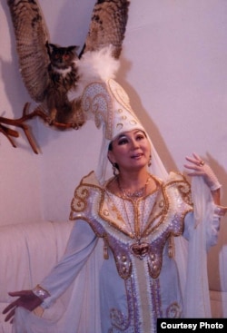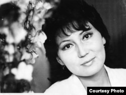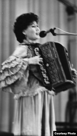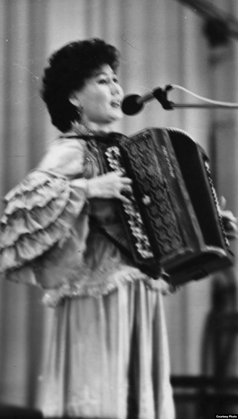 Әнші Мәдина Ералиева өзін елге әйгілі еткен «Ақбаян» әнін шырқап тұр, 1978 жыл. Жеке мұрағаттағы сурет.