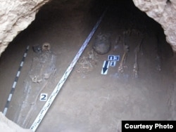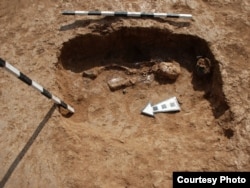 Әйел адамның жанына шеберлердің қолымен құйылған қыш ыдыс, жіп иіретін ұршықтың басы, әйнектен жасалған моншақ қойылған және бас жағында құрбандыққа шалынған жануардың сүйектері болған.