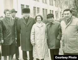 Жазушы Қалмұқан Исабай (оң жақтан екінші) зайыбымен бірге президент сайлауына дауыс беріп келе жатып, жолай жолыққан президенттікке жалғыз кандидат Нұрсұлтан Назарбаевпен (сол жақтан үшінші) түскен суреті. Алматы, 1 желтоқсан 1991 жыл. Жазушының жеке мұрағатындағы сурет.