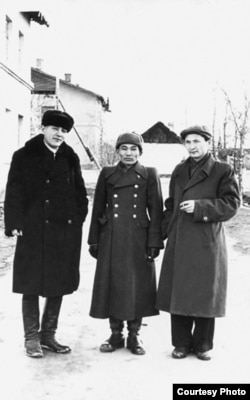 Совет армиясының офицері Қалмұқан Исабай (ортада) - Ильменау қаласының коменданты, Германия, 1945 ж. Жазушының жеке мұрағатындағы сурет.
