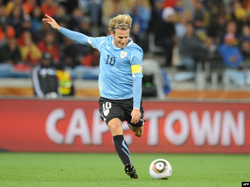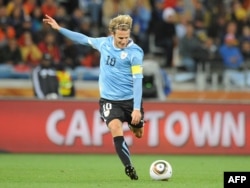 Уругвайлық шабуылшы Диего Форлан өз командасының жартылай финалдағы бірінші голын соғудың алдында. 6 шілді 2010 жыл.