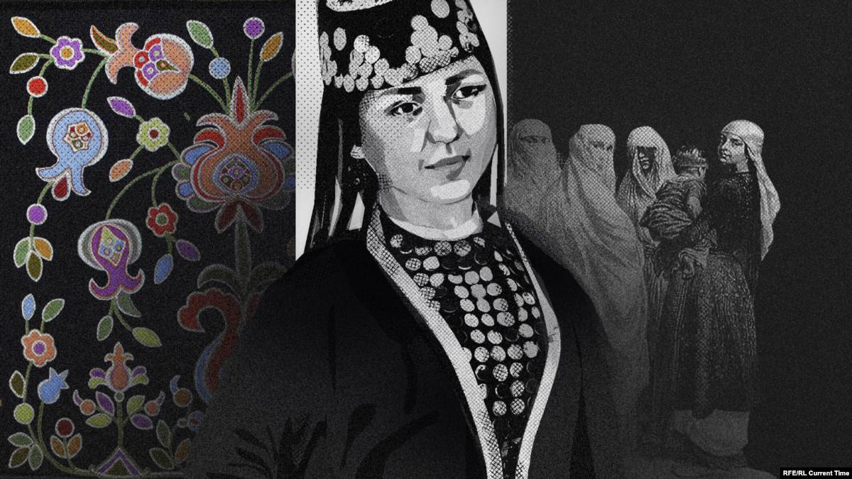 "Үйден шығарда әйелдер шадрамен қоса бетін кенеп орамалмен (рубенд) көлегейлеген, екі көздің орнында торланған тесік аздап сәуле түсіретін» деп жазады Измира Кулиева.