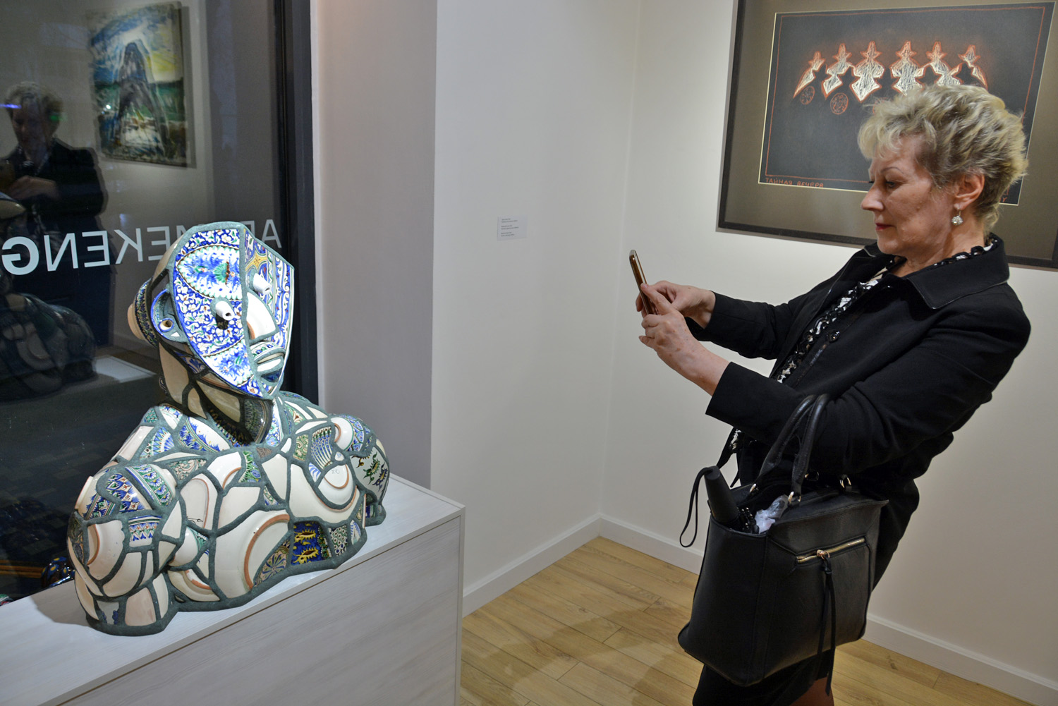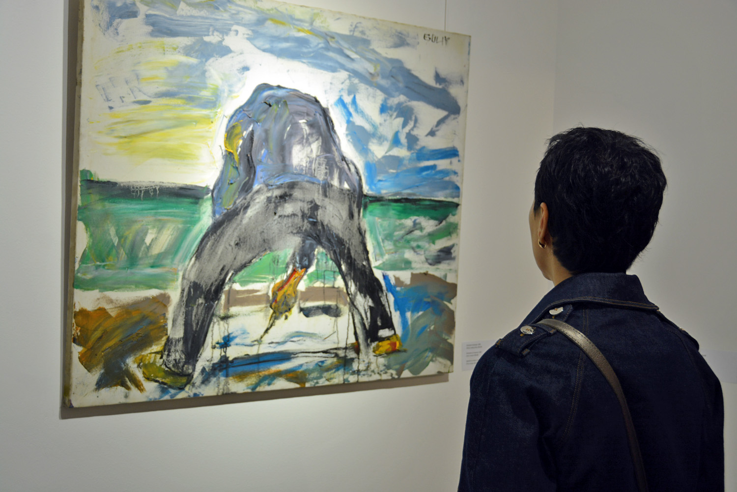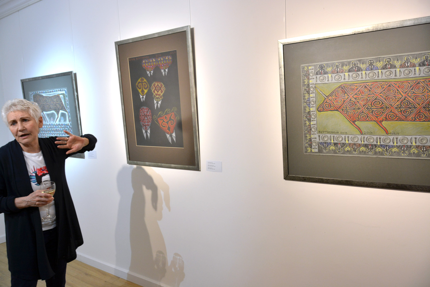 Көрме кураторы Валерия Ибраева "Ат және аттың күші" жұмысының жанында тұр. Ортада – "Ақ жағалылар", оң жақта – "Құрбанға шалынған бұқа" туындысы. Алматы, 4 сәуір 2019 жыл.