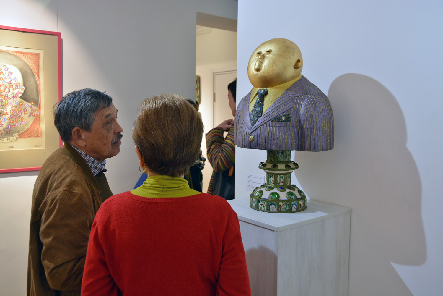 Көрме қабырғаларының бірін қымбат көлік пен киімді жақсы көретін, дәмді ас ішкенді ұнататын «нағыз қазақстандық шенеуніктің өмірінен алынған» десе болады. Сол жақта – «Ат және аттың күші» жұмысы, ортада – «Ақ жағалылар», оң жақта – «Құрбанға шалынған бұқа» (бұқаның маңында өрнек ретінде қасық-шанышқысы бар тәрелкелер салынған).