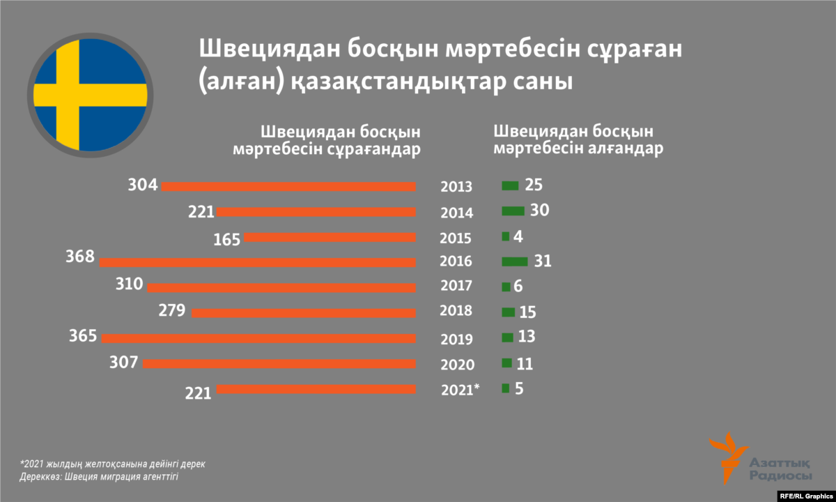 Мәселен, Швециядан 2010 жыл 350 қазақстандық босқын мәртебесін беруді сұраса, 2016 жыл 368 қазақстандық өтініш жазған. 2019 жылы – 365 қазақстандық, 2020 жылы 307 қазақстандықтан босқын мәртебесін сұраған