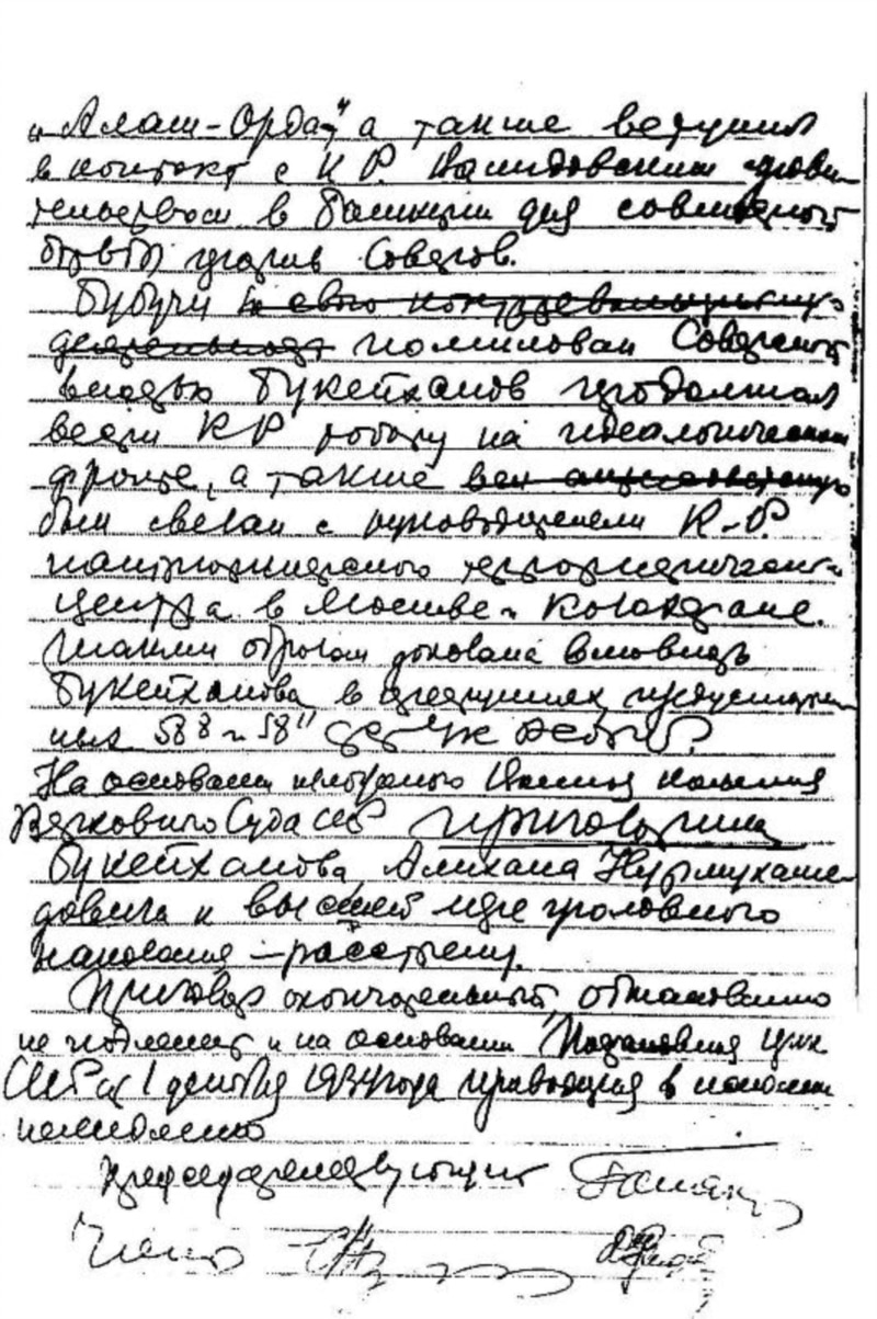 Әлихан Нұрмұхамедұлы Бөкейханды ату жазасына кесу туралы СССР Жоғары Соты Әскери алқасының 1937 жылы қыркүйектің 27-сі күні шығарған үкімінің көшірмесі. Ресей ФСБ-ның мұрағатындағы құжат.