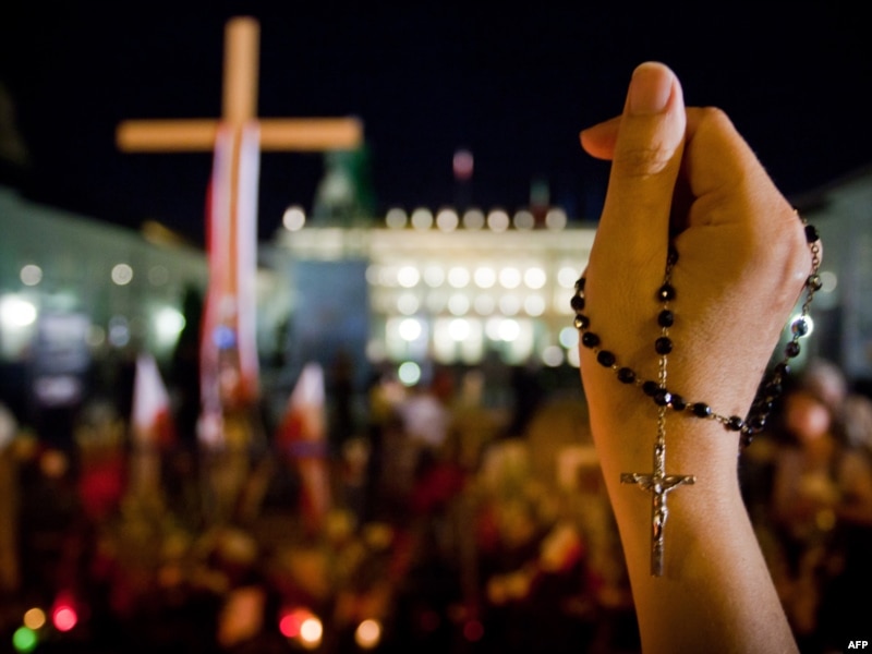 Варшавада президент сарайы алдына қойылған крест маңындағы шеру. Польша, 10 тамыз 2010 жыл. (Көрнекі сурет)
