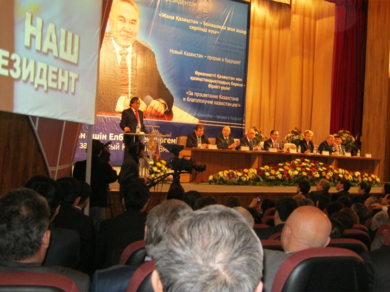 Олжас Сүлейменов Нұрсұлтан Назарбаевтың өкілетін 2020 жылға дейін референдум арқылы ұзарту жөніндегі бастамашыл топ алдында сөйлеп тұр. Өскемен, 23 желтоқсан 2010 жыл.