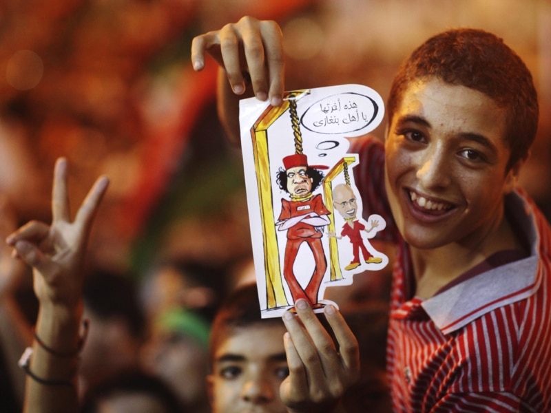 Балалар "дарға тартылған" Муаммар Каддафи мен оның ұлы Сайф әл-Исламның карикатурасын ұстап тұр. Бенгази, 22 тамыз 2011 жыл