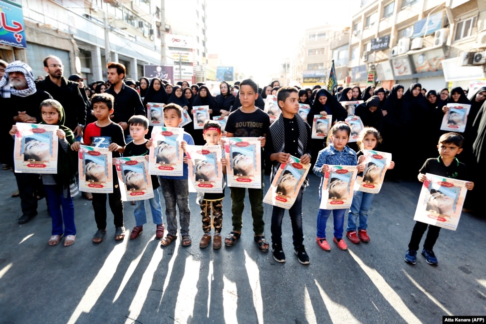 Ахваз қаласында шабуылдан көз жұмған 4 жасар баланы жерлеу кезінде баланың суретін ұстаған балалар. Иран, 24 қыркүйек 2018 жыл