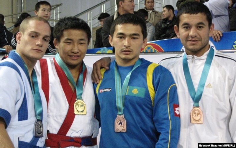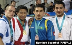 66 келі салмақта күш сынаған палуандар (солдан оңға қарай): голландиялық Демель Шул – күміс жүлде, Санжаасүренжиң Миарагча – алтын, қазақ Қуаныш Мұратов пен өзбек Әлім Равшанов – қола жүлдегерлер. Астана, 23 қазан 2010 жыл.